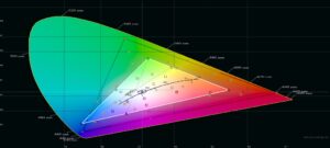 El uso de LCD en lugar de DLP tiene un impacto directo en los colores, ya que el espacio de color es mucho menor. ¿Qué significa esto? Significa que el número de colores disponibles para la visualización es mucho menor, lo que resulta en una imagen más incolora. El triángulo negro indica el espacio de color que este proyector debería poder alcanzar idealmente y el triángulo con los bordes blancos corresponde al espacio de color que este proyector es capaz de reproducir.