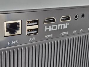 [El Thundeal TDA6 tiene una conectividad generosa para un proyector de este precio. Tiene un puerto ethernet (aunque puede funcionar con wifi), también hay 2 puertos HDMI, 2 puertos USB 2.0, una salida AV y una salida de auriculares.Ajustes de las imágenes