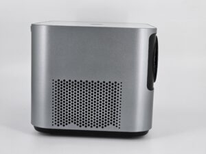 El anterior Thundeal que probé tenía un diseño de proyector de lámpara tradicional. Este nuevo TDA6 se inspira libremente en la gama de proyectores XGIMI Horizon, utilizando el formato cúbico y su aspecto metálico. El resultado es bastante acertado, y la estética de este proyector le da más credibilidad que el modelo anterior, pero la comparación con XGIMI se detiene ahí. Este proyector está fabricado totalmente en plástico, y aunque el plástico parezca de buena calidad, la diferencia con un proyector de gama media es muy notable
