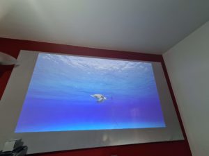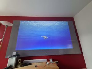 Mi sala de proyección es rectangular, 4.6m x 2.9m (altura 2.2m). La pared de proyección es una pared normal sobre la que he aplicado pintura blanca sin ningún tratamiento particular. Las paredes laterales son más oscuras (gris oscuro y rojo) para acentuar el contraste con la pared blanca y evitar el reflejo excesivo de la luz.Tengo la posibilidad de colocar un proyector en la parte posterior de la sala a una distancia de unos 4 metros de la pantalla. También tengo la opción de colocar un proyector de corto alcance al pie de la pared.